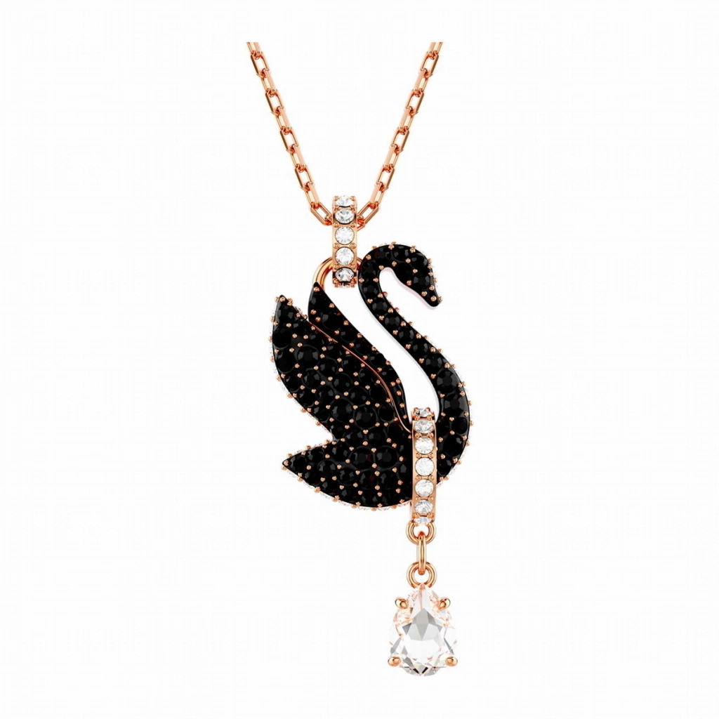 Con sus tonos intensos y cautivadores, este colgante se inspira en el emblema característico de Swarovski. Este diseño incorpora una cadena bañada en tono oro Rosa y presenta un motivo de cisne, expertamente decorado con Swarovski ReCreated™ crystals de color Jet Black en pavé. Una Swarovski Zirconia transparente en talla de pera cuelga delicadamente de un eslabón en tono oro Rosa. Luce esta atractiva pieza para añadir sofisticación instantánea a tu estilo.