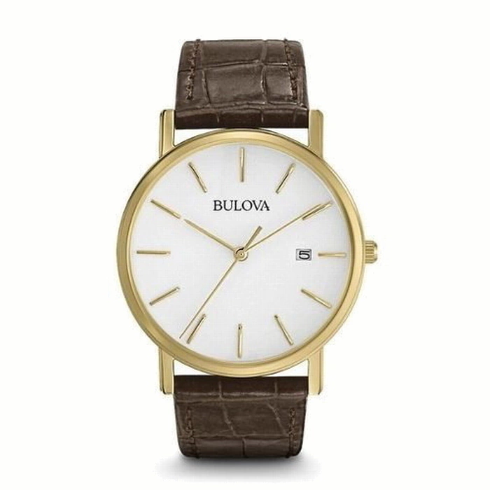 -Cuadrante blanco con diseño. Fecha. Caja de acero inoxidable. Correa de piel café.