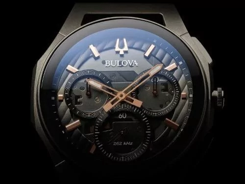 De la nueva colección CURV. El primer movimiento cronógrafo curvo del mundo. Con movimiento de cuarzo de alto rendimiento, con una frecuencia de vibración de 262 kHz para conseguir una exactitud inigualable. Reloj con cronógrafo, con 5 agujas, caja y broche de titanio y acero inoxidable con detalles en oro rosa, esfera en gris oscuro, tapa de fondo transparente y a rosca con carátula esqueleteada, cristal de zafiro curvo, correa de caucho negra y resistente al agua hasta 30 m.