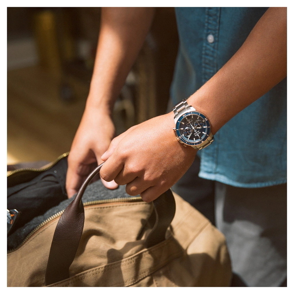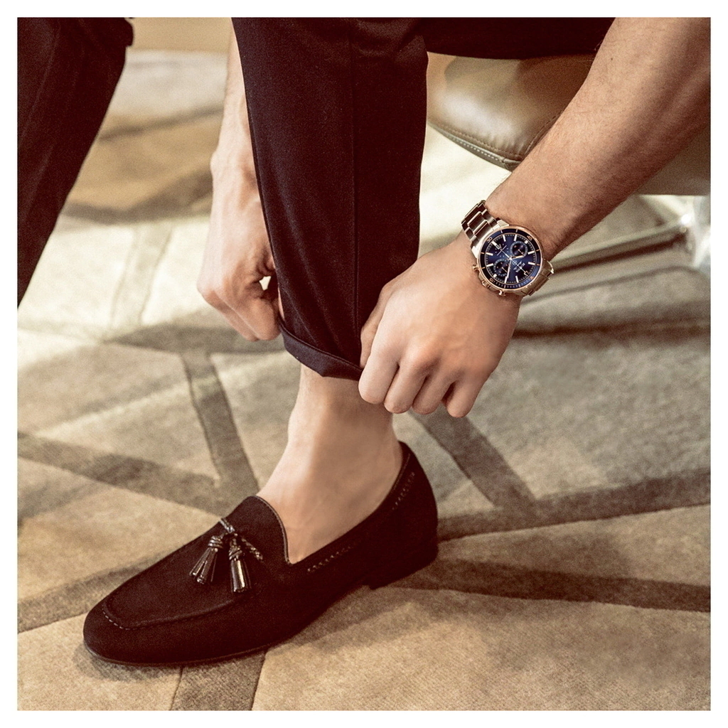 New Movimiento cronógrafo de seis manecillas. Caja realizada en acero inoxidable acabado PVD oro rosa, inserto de cristal azul sobre bisel giratorio, carátula azul, manecillas y marcadores luminiscentes, fechador, cristal mineral abombado, broche tipo hebilla y resistencia al agua de hasta 200 metros.