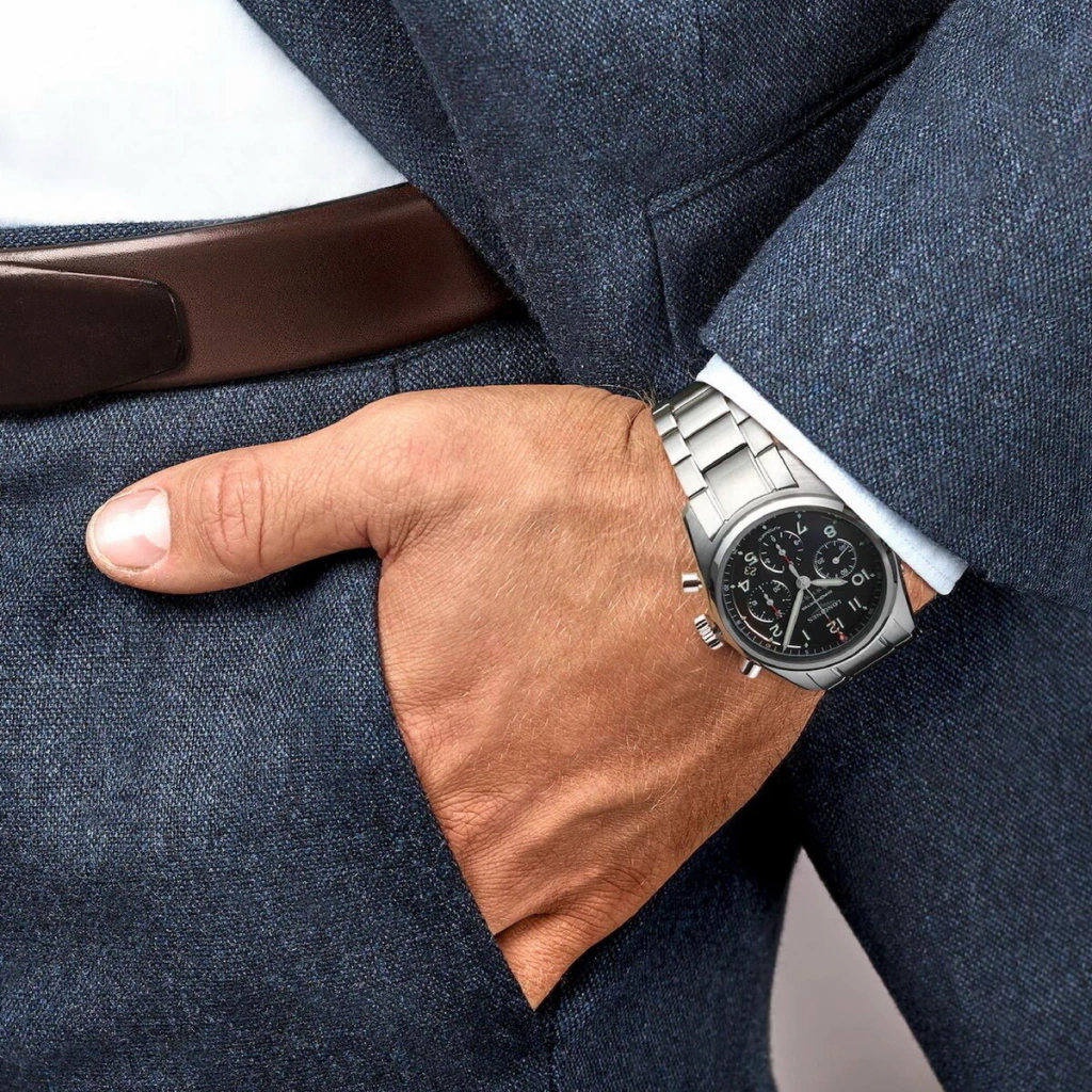 Funciones del cronógrafo: Mecanismo de cronógrafo: aguja central de 60 segundos, contador de 30 minutos a las 3 horas y contador de 12 horas a las 6 horas.