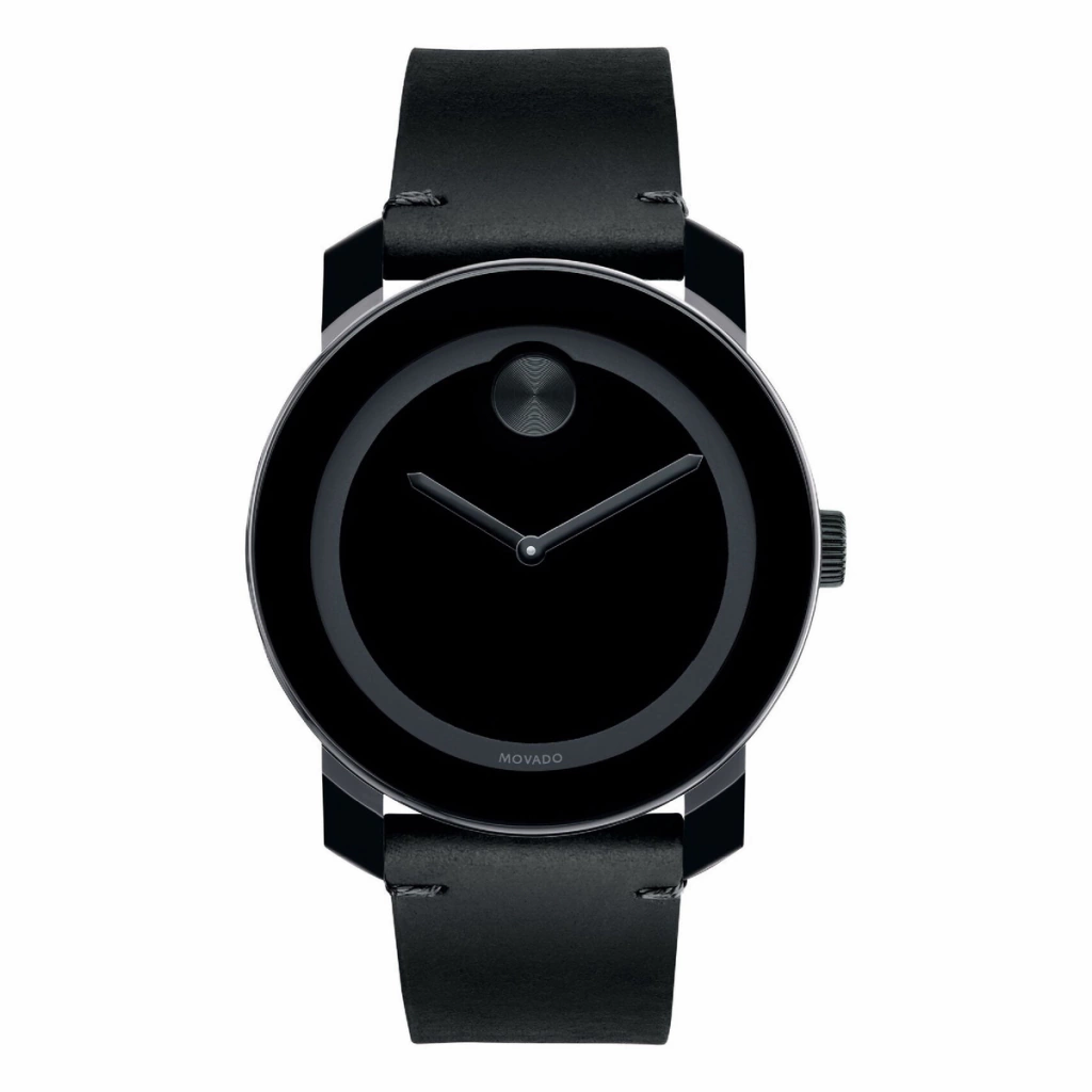 Reloj Movado BOLD grande, caja de acero inoxidable y material compuesto TR90 negro de 42 mm, esfera negra con punto de rayos de sol a juego, manecillas y anillo exterior tono sobre tono, correa de piel de toro colorado negra con detalle de pespunte negro y baño de iones negro Hebilla de acero inoxidable, cristal K1, movimiento de cuarzo suizo, resistente al agua hasta 30 metros.
