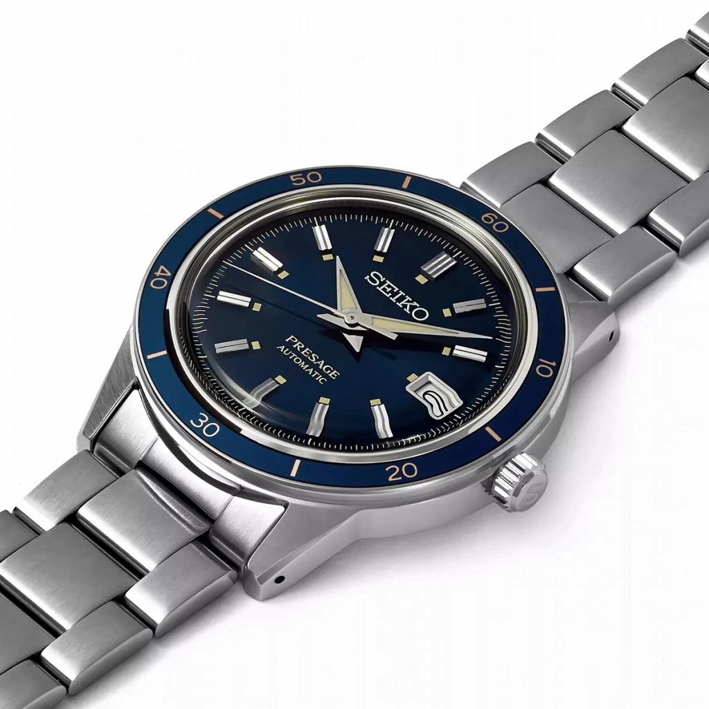 Colección Presage Style60s. Ofreciendo lo mejor de la relojería mecánica japonesa, la Colección Presage fusiona tecnología de precisión con una artesanía y un diseño superiores. Con líneas angulares amplias y detalles vintage como cristales en forma de caja, índices facetados y un diseño de agujas definido, además del uso de tonos neutros y tierra, la colección Style60s crea una atmósfera cálida y retro, perfecta para la actualidad. Celebrando el espíritu innovador de la década de 1960, la colección se inspira particularmente en el "Crown Chronograph" de Seiko de 1964, el primer reloj japonés con función de cronómetro. Enmarcado por un bisel azul con detalles en oro rosa, la esfera azul incluye un calendario con fecha y agujas e índices LumiBrite color beige. El fondo de caja transparente atornillado permite apreciar el movimiento de 23 rubíes con capacidad de cuerda manual, una frecuencia de 21.600 alternancias por hora y una reserva de marcha de aproximadamente 41 horas. Elaborado en acero inoxidable, este distintivo reloj incluye un cierre desplegable de triple pulsador. 5 bar, resistente al agua hasta 50 m