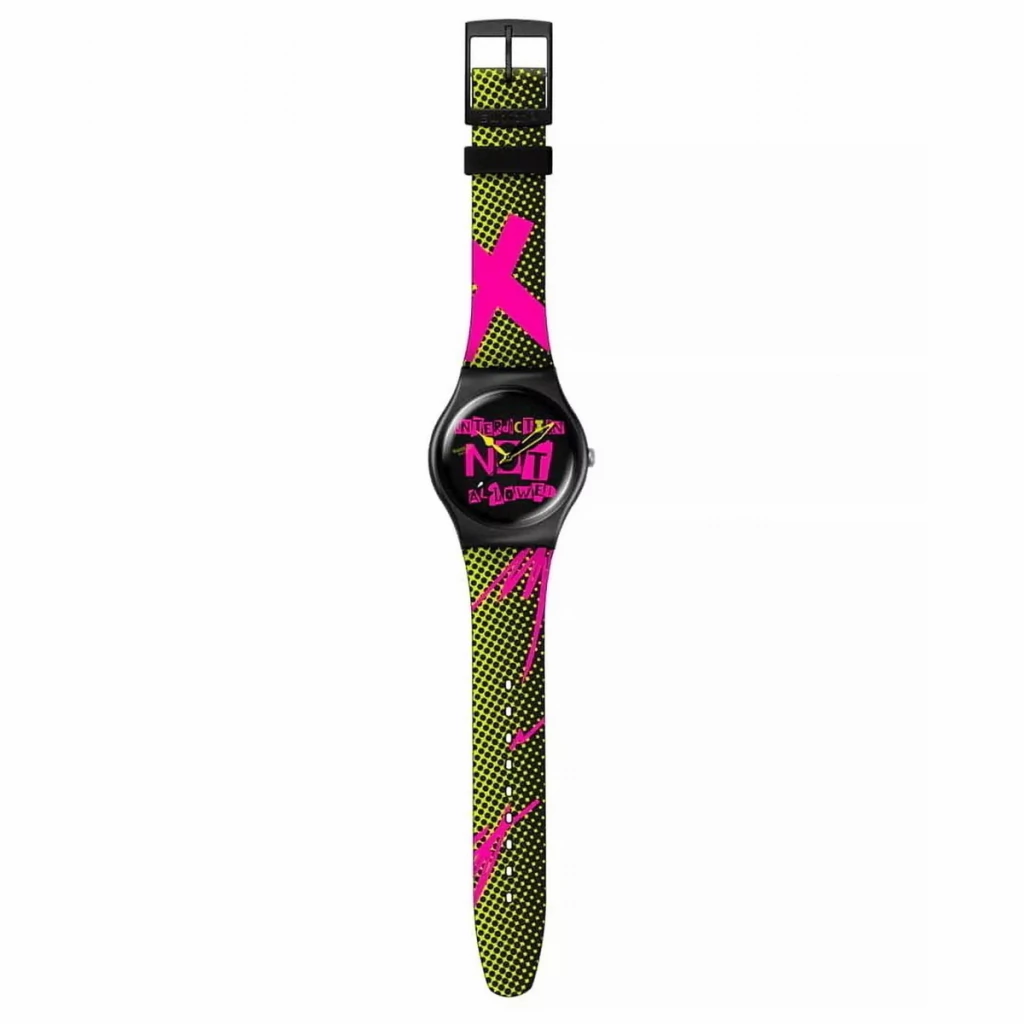 Este reloj destaca por su esfera negra y su estampado de varios colores que dice: "Interdiction not allowed" (No admitimos prohibiciones). La aguja horaria y el minutero son de color amarillo y tienen distintas formas. El segundero es de color negro. Todas las agujas están bajo un cristal de origen biológico y brillan en la oscuridad. La caja de Bioceramic negra mate va a juego con una correa negra mate que tiene un estampado de varios colores, una trabilla negra mate y una hebilla negra mate también de Bioceramic.