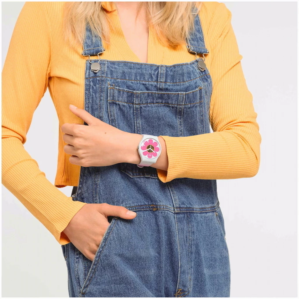 ¡Más flores para ti! El diseño de este reloj inspirado en los 60 ilumina cualquier estilo gracias a su flor en el centro. Está diseñado con una caja en BIOCERAMIC de color gris claro, el cristal de origen biológico, la correa de silicona de color gris claro con un estampado rosa y la esfera blanca con un estampado de flores multicolores.