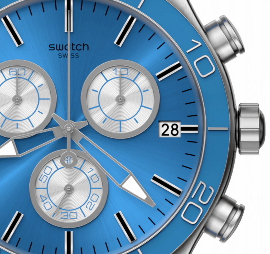 El diseño de este reloj cronógrafo de acero inoxidable incluye una correa azul con líneas horizontales y una correa con hebilla de acero inoxidable engastada en la caja de acero pulido. Pero la estrella de este reloj IRONY CHRONO es la esfera, con su acabado azul pulido, contadores plateados y adornos negros en los índices, la pista del minutero y el logotipo. Los detalles finales los proporcionan el indicador de fecha a las 3 en la esfera y los números e índices plateados en el bisel azul de acero inoxidable.
