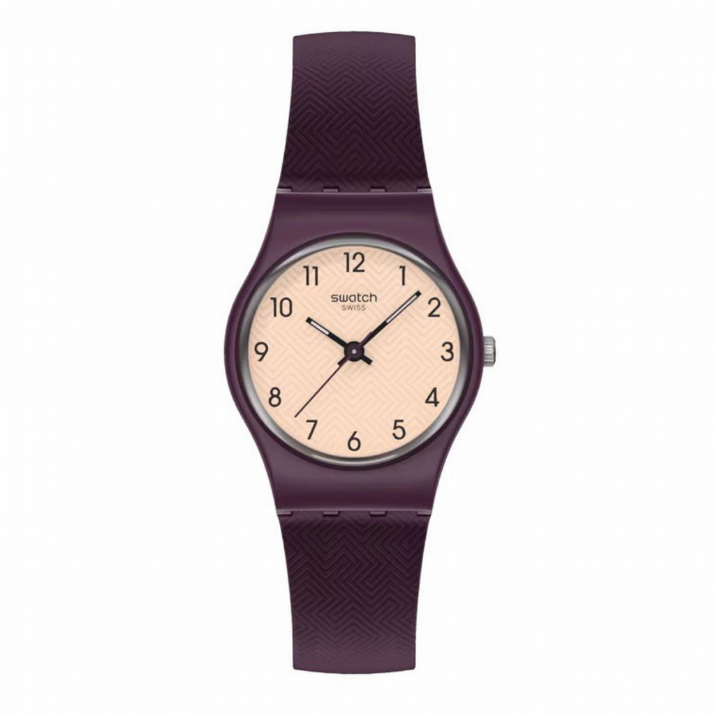 Este pequeño reloj tiene una esfera texturizada beige con números impresos en negro, aguja horaria y minutero de color negro que brillan en la oscuridad y un segundero morado oscuro en una caja de color morado oscuro mate. Una correa texturizada de color morado oscuro mate con trabilla y hebilla morado oscuro mate completan el reloj.